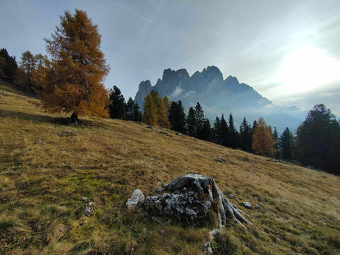 Le Odle ora sono tornate vicino. Mi sembra quasi di sfiorare quel suo versante orientale entrando maggiormente all'interno di quei boschi per portarmi nuovamente, a distanza di giorni, lungo la Adolf Munkel Weg. Punti di vista verso la montagna, mentre per qualche attimo il sole sembra voler tornare protagonista di questa mia giornata che nel silenzio assume la sua unicità.