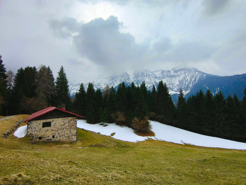 La quiete avvolge questi istanti, mentre il palato si abbandona a un semplice nutrimento che sa di Natura e di essenzialità. Una brezza lieve attraversa i prati e sfiora i masi alpini, silenziosi custodi di epoche lontane, così distanti da apparire ormai quasi inconcepibili. La neve, accompagnata da un freddo improvviso, mi costringe a cercare calore in abiti più pesanti. Ma non vi è sorpresa in questo: conosco bene il respiro incostante di questa stagione, e non vi è nulla che possa intimorirmi.