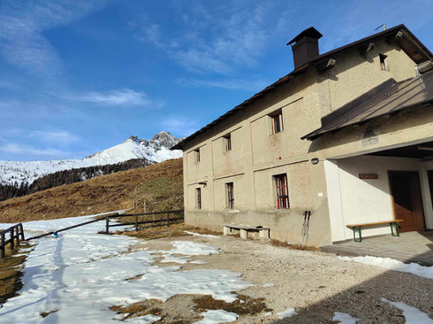 La mia, però, non è un’avanzata decisa. È piuttosto un’esplorazione discreta, un atto di curiosità personale: osservare, annotare con lo sguardo, prendere confidenza con pendii che oggi restano fuori dal mio cammino. Tra questi, il Col di San Giovanni (2251 m), completamente avvolto da un candore assoluto. Una lieve battitura sulla neve, visibile e invitante, cattura la mia attenzione. Mi attrae con la stessa forza con cui un dolce cattura lo sguardo di un bambino: desiderabile, vicino, ma ancora da rimandare. E poi c’è il passo stesso, poco distante, custode silenzioso di una di quelle malghe che sembrano non conoscere il tempo. Ma questa, lo so già, sarà un’altra storia, da raccontare più avanti.