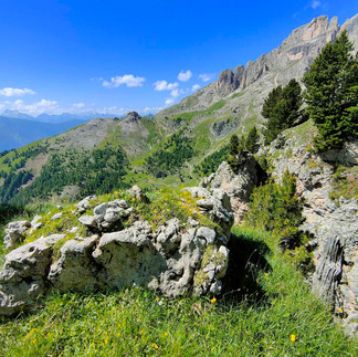 La baita è solo un punto di riferimento. Da questo suo punto panoramico prende così vita il Vial de la Feide, tra boschi incantati e piccoli prati colorati da fioriture illuminate da questo mio meraviglioso sole estivo. La Val de Vaiolet mi offre i suoi ultimi punti di vista, prima di lasciare definitivamente spazio a un mondo roccioso completamente nuovo. Il Pian de Sot Albe è un ampio "corridoio" naturale che rimane così in quota, dove la Val di Fassa entra definitivamente all'interno di questo cammino.