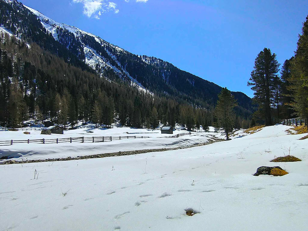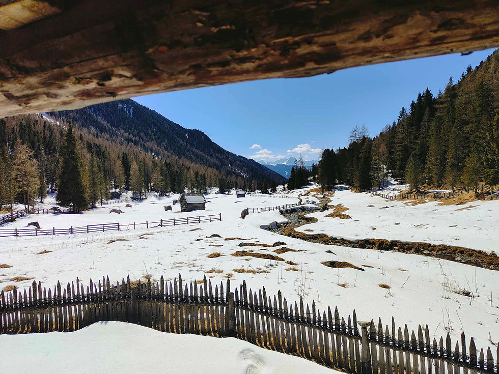 I boschi si alternano ad ampi spazi prativi, dove le immancabili staccionate in legno disegnano i confini dei pascoli estivi. Spazi aperti e foresta si rincorrono, e la neve, in alcuni tratti, torna a farsi più compatta, restituendo al paesaggio una suggestione intensa, fatta di contrasti e colori netti, vivi, quasi scolpiti.